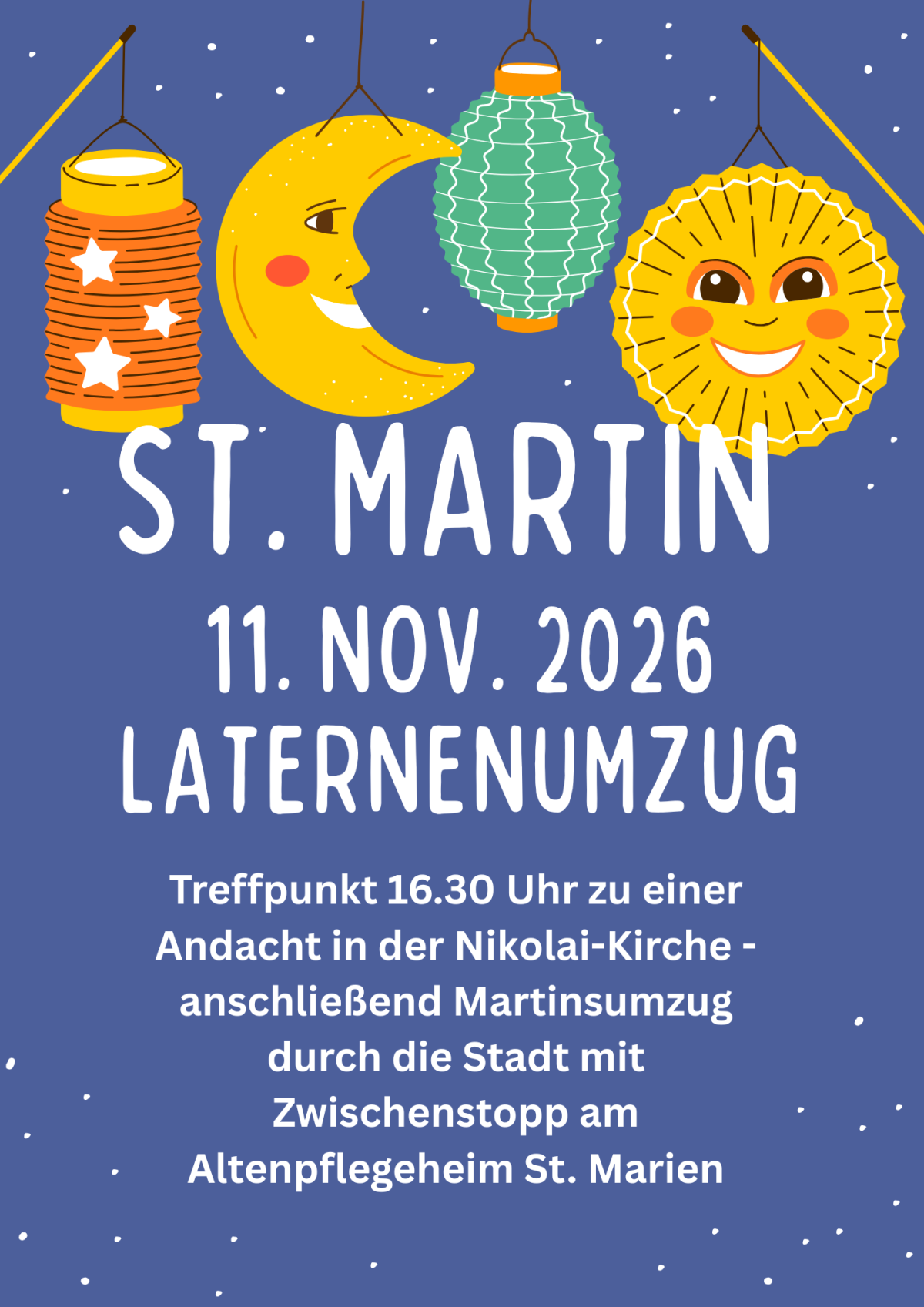 Oktober282025 Canva 28.10.2025 Martinsumzug in Bad Liebenwerda Herzliche Einladung zum Martinsfest am Dienstag, 11. November 2025! Wir treffen uns um 16.30 Uhr in der Nikolai-Kirche zu einer Andacht und anschließendem Martinsumzug durch die Stadt. Mehr Fotos